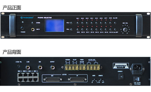 功能控制 音量調節鍵二個(VOL+、VOL-),手動選擇按鍵十六個,電源開關鍵一個,全開鍵一個,全關鍵一個,地址設置開關一個(1位),提示音按鍵一個,尋呼麥克風接口四個RMIC1 ~ RMIC4,線路輸入口一個,緊急輸入口一個,LCD顯示屏一個,MIC音量調節旋鈕一個,提示音音量調節旋鈕一個,總電源開關一個,聯機控制接口2個,短路電源激活口一個